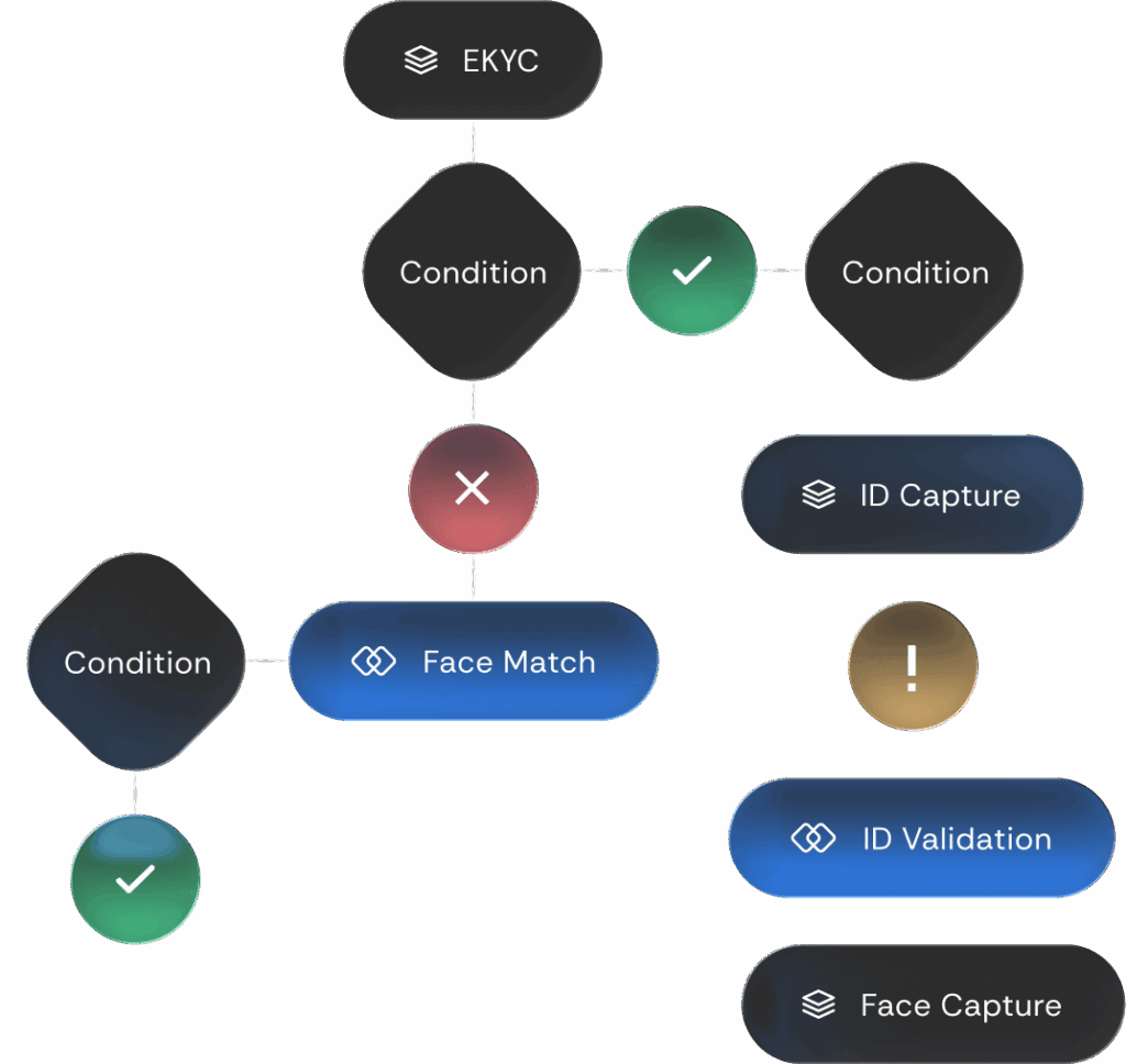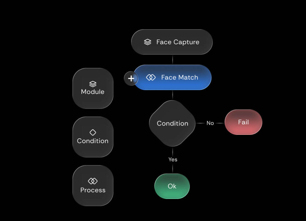 Build flows using four node types: Modules (capture data), Processes (validate and match), Conditions (branch with logic), and Results (set outcomes), control every step of your verification flows.