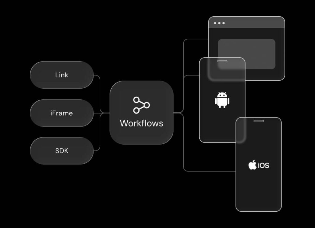Deploy Workflows seamlessly into your product with direct onboarding links, iFrame, or SDKs for iOS, Android, and React Native, delivering a consistent user experience across platforms.