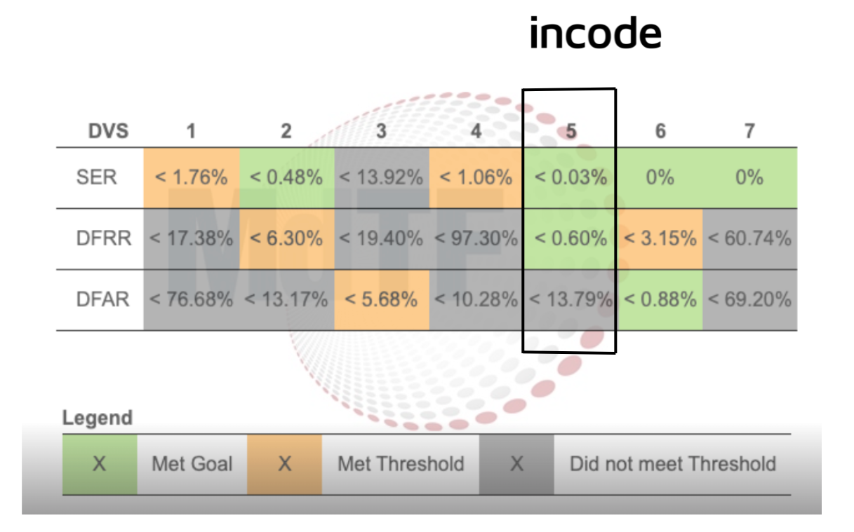Of the systems evaluated, only two met at least two of the three DHS S&T performance goals, and Incode was one of them. This result builds on Incode's top performance in Track 1, where Incode was one of five systems to meet DHS S&T performance goals in the Selfie Match to Document track. Read more here.