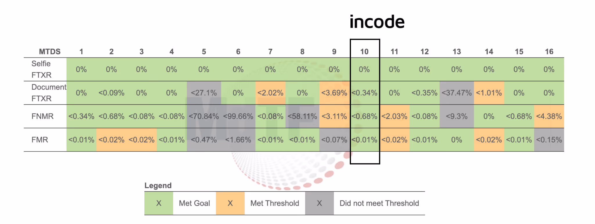 Incode’s submission was evaluated among 16 participating vendors in the Selfie Match to Document track. In the final results, only five systems met the more stringent DHS RIVR goals across all metrics. While DHS does not publicly map vendor names to system IDs, Incode’s submission (MTDS10) was among the systems that met all DHS Science and Technology (S&T) performance goals.